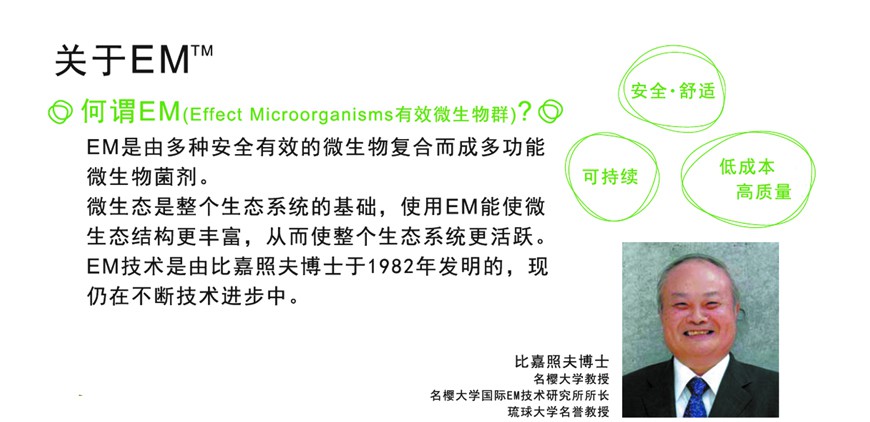 EM是日本琉球大學(xué)比嘉照夫教授發(fā)明的有效微生物群技術(shù)及產(chǎn)品,它由光合菌類、乳酸菌類、酵母菌類等三大菌群的多屬多種微生物組成。